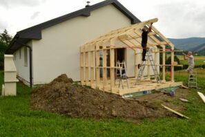 Konstrukce stěn a střechy je tvořena soustavou dřevěných rámů.